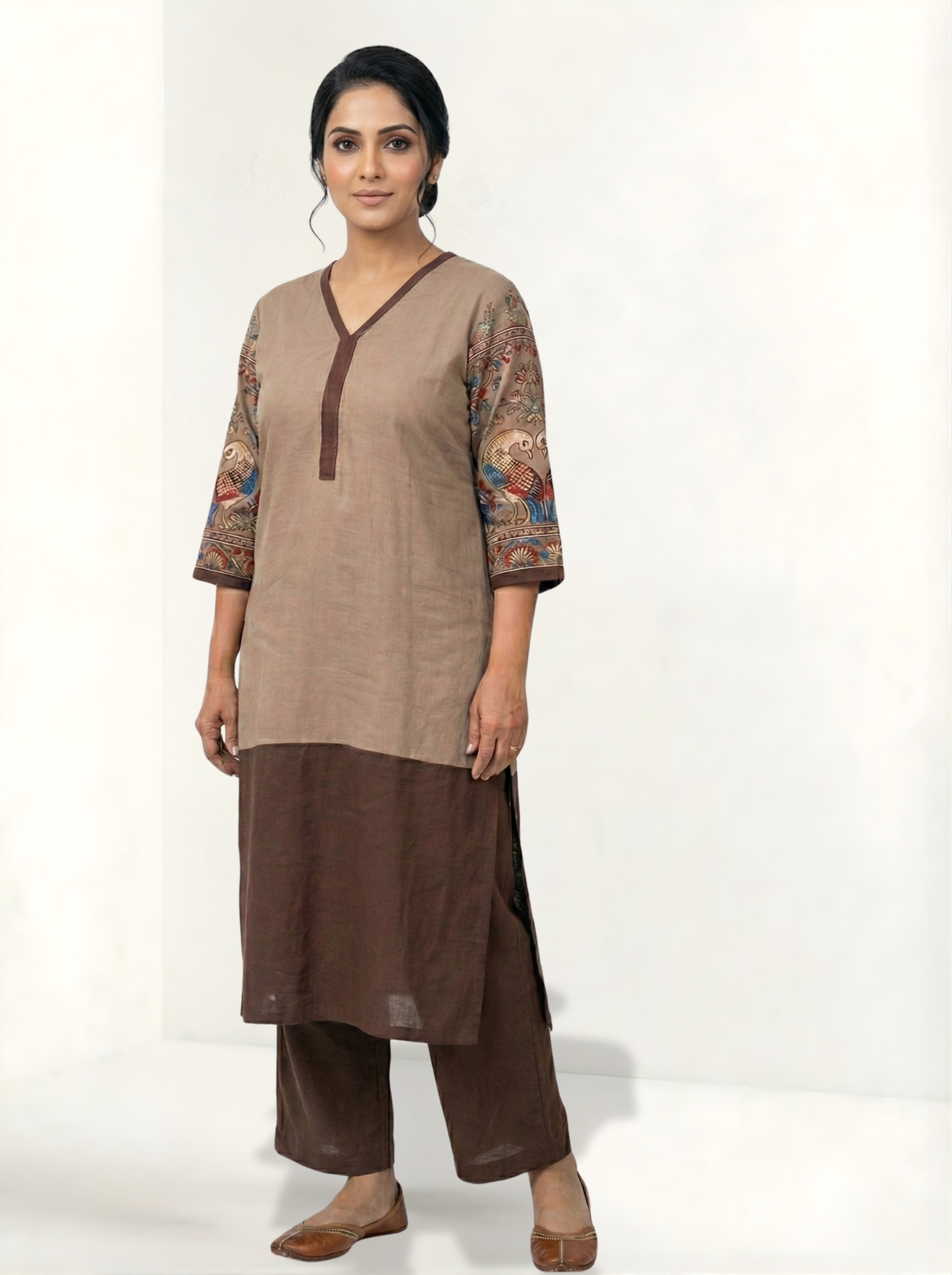 The V-neckline adds a touch of simplicity and openness, enhancing the kurta’s composed aesthetic. The contrast lower panel grounds the design, adding depth without overpowering the artwork.